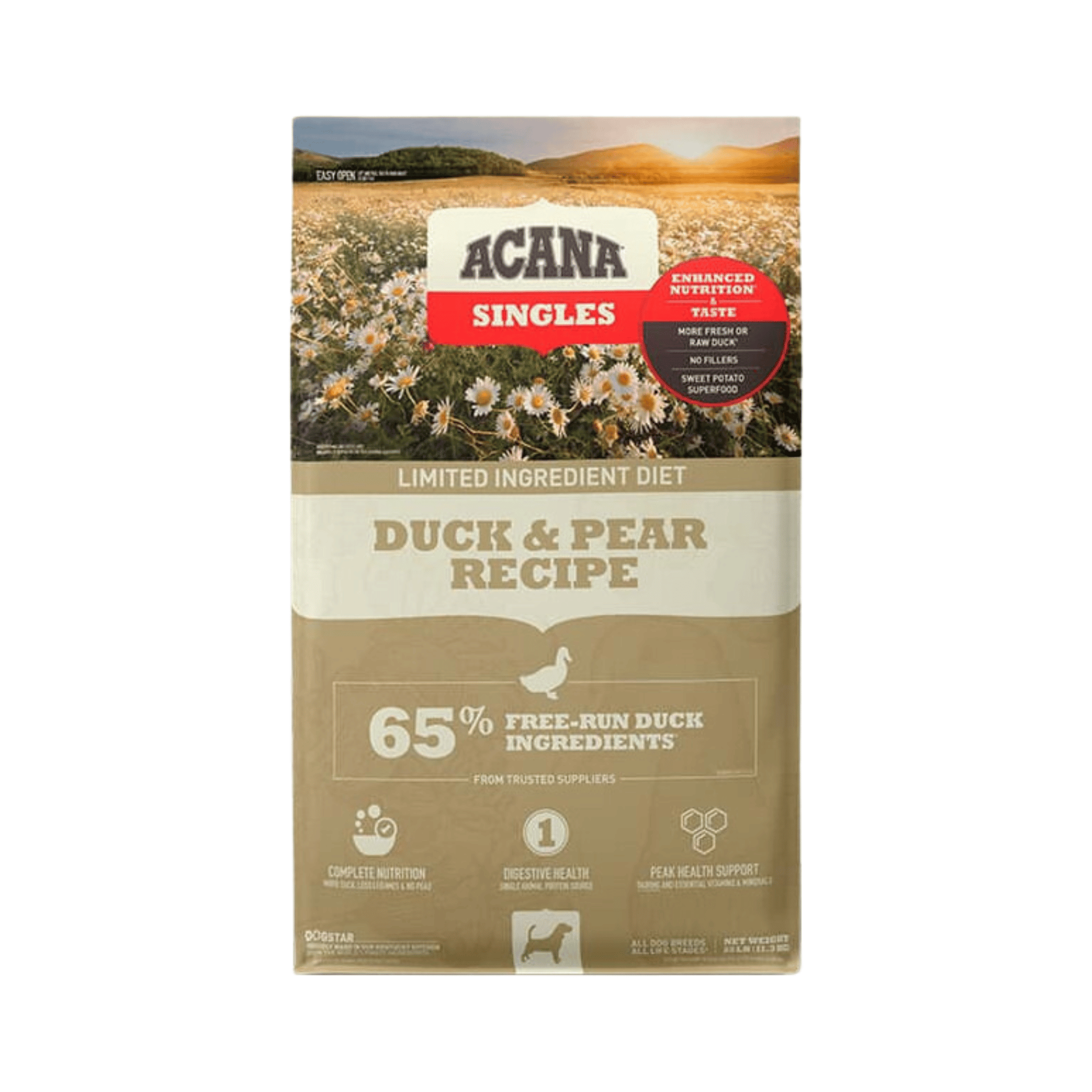 Con un 50% de pato Muscovy para nutrir a tu perro de acuerdo a sus necesidades evolutivas, ACANA Duck & Pear contiene una sola proteína animal de fácil digestión.