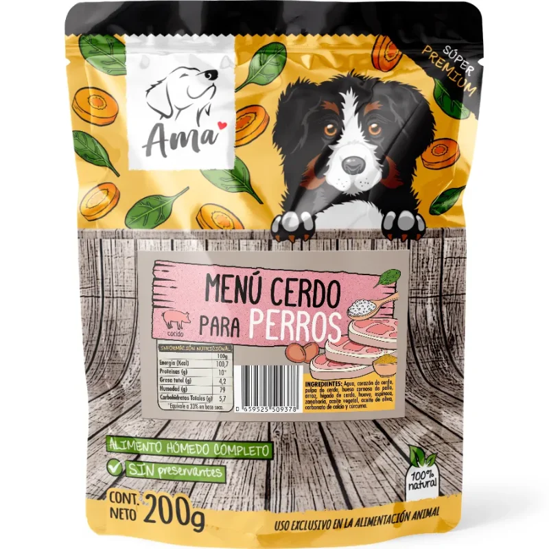 Ama Menú Cerdo es un alimento húmedo natural desarrollado por veterinarios que ofrece una nutrición completa y equilibrada para perros adultos y cachorros, con una receta de cerdo que entrega proteína de alto valor biológico y excelente digestibilidad. Cada sachet de 200 gramos contiene una preparación cocida con textura casera, elaborada con insumos autorizados para consumo humano y libre de aditivos artificiales, lo que la convierte en una alternativa segura para el uso diario. Gracias a su alto contenido de humedad, favorece la ingesta de agua y el bienestar digestivo, y su práctico envase esterilizado permite conservar el producto a temperatura ambiente hasta el momento de abrirlo. Es ideal tanto para servir como ración completa como para mezclar con alimento seco y aumentar la palatabilidad de la dieta de tu perro.