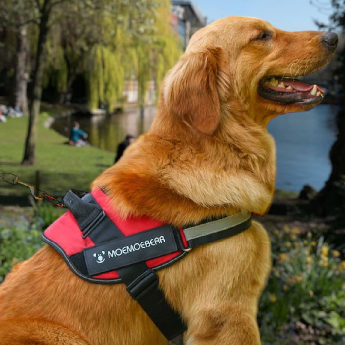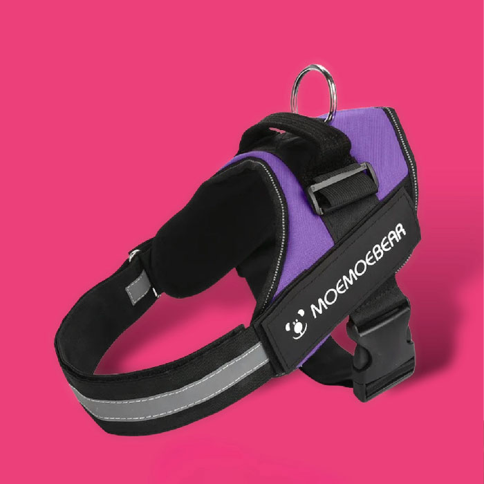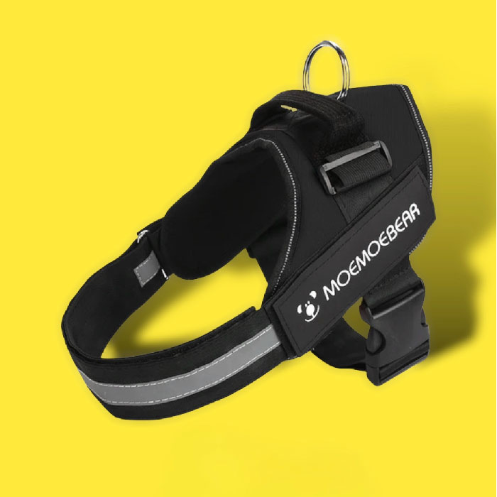 Arnés acolchado en la parte superior con material grueso impermeable, correas ajustables en el pecho, franjas reflectivas, herrajes de alta resistencia y asa de agarre en la parte superior para mayor control.