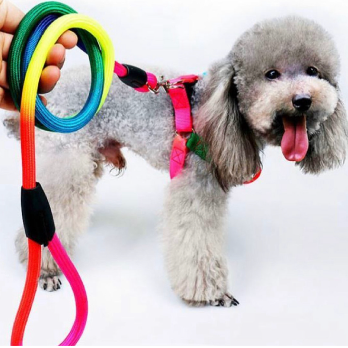 Arnés de tiras con los colores del arcoiris, graduable, con herrajes altamente resistentes, e incluye correa redondeada; diseñado para mascotas de razas pequeñas y medianas.