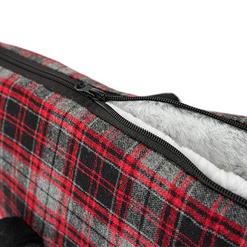 Con un clásico diseño de cuadros grises y rojos. La parte superior del bolso se cierra con una cremallera. Una de las esquinas queda abierta para que su mascota pueda asomar la cabeza y disfrutar de las vistas.
