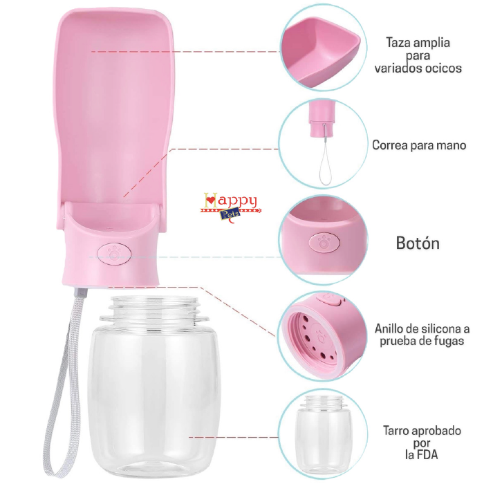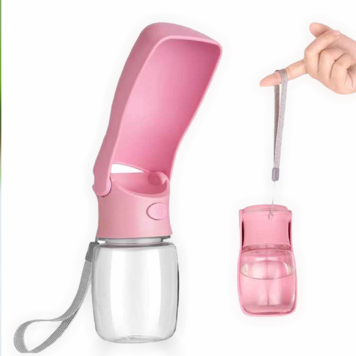 Botilito automático plegable, para llevar el agua de tu peludo a todas partes y poder servirle en el mismo platico que viene adjunto. Al oprimir el botón deja pasar el agua para llenar el plato y al soltarlo detiene el flujo, para poder darle de beber al perro, al terminar de beber se puede oprimir de nuevo el botón y el agua ingresara nuevamente al interior de la botella para evitar desperdiciar el agua. El botón bloquea o permite el paso del agua, el plato es plegable para ahorrar espacio y poder llevarlo con mayor facilidad sin que ocupe tanto espacio.