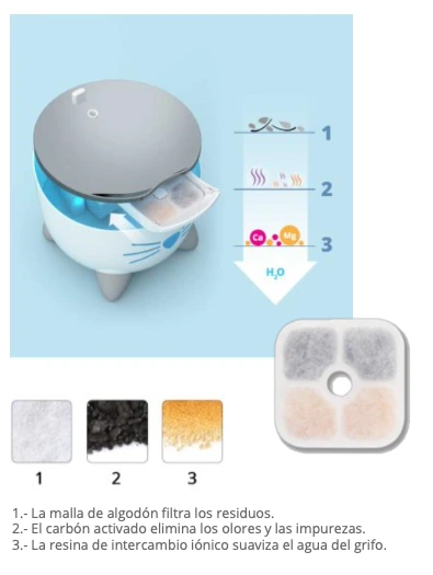 - Resina de intercambio iónico: suaviza el agua al reducir el calcio y magnesio, disminuyendo el riesgo de enfermedades del tracto urinario en tu gato.