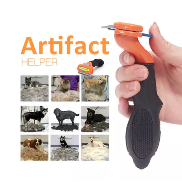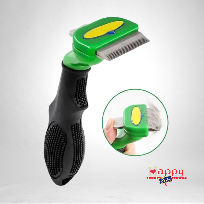 Cepillo deslanador, con borde en Acero Inoxidable, diseño especial de cerdas metálicas aplanadas sin filo para no cortar, ideal para deslanar a profundidad o quitar el pelo muerto; por el diseño de sus cerdas, saca pelo sin cortar ni reventar el pelo, los bordes no son filosos y no puede causarle ningún daño al cuero cabelludo del peludo a menos que se utilice de manera errónea. Atraviesa la capa superior para eliminar de manera segura y fácil el pelo suelto de la capa inferior sin dañar la capa superior o cortar la piel. Con botón en la parte posterior para liberar todo el pelo que se ha quedado atrapado en el cepillo, de manera fácil y rápida; y mango ergonómico que se adecua de manera fácil y cómoda a la mano del usuario. Ampliamente usado en las peluquerías para perros. Material liviano, resistente, fácil de higienizar.