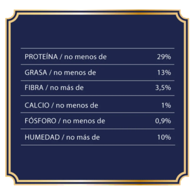 | Vitaminas & Minerales | Incluye vitaminas A, D3, E, B12, Calcio, Fósforo, Zinc, Hierro |