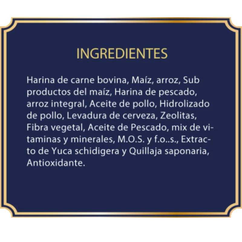Harina de carne bovina, maíz, arroz, harina de pescado, aceite de pollo, aceite de pescado, pulpa de remolacha, levadura de cerveza, zeolitas, fibra vegetal, prebióticos M.O.S y F.O.S, extracto de yuca schidigera y quillaja saponaria, mezcla de vitaminas y minerales, antioxidantes naturales.