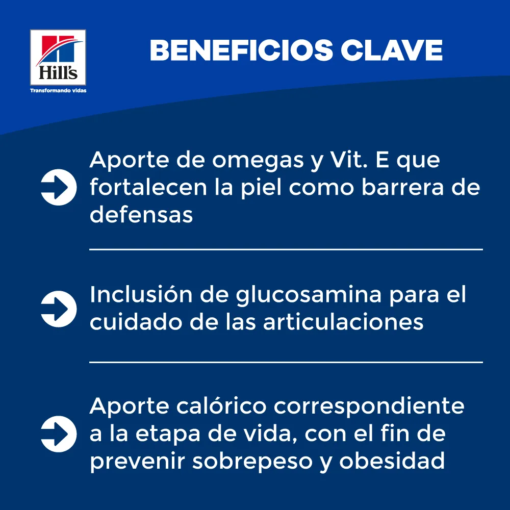- Mezcla de omega 6 y vitamina E para una piel sana y un pelaje brillante.