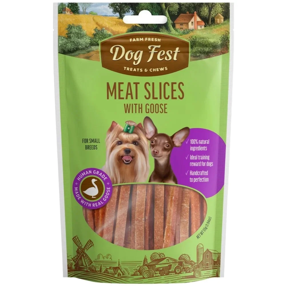 Dog Fest Treats & Chews Meat Slices with Goose, Snack para Perros, Rebanadas de Carne con Ganso, bolsa de 55 gr