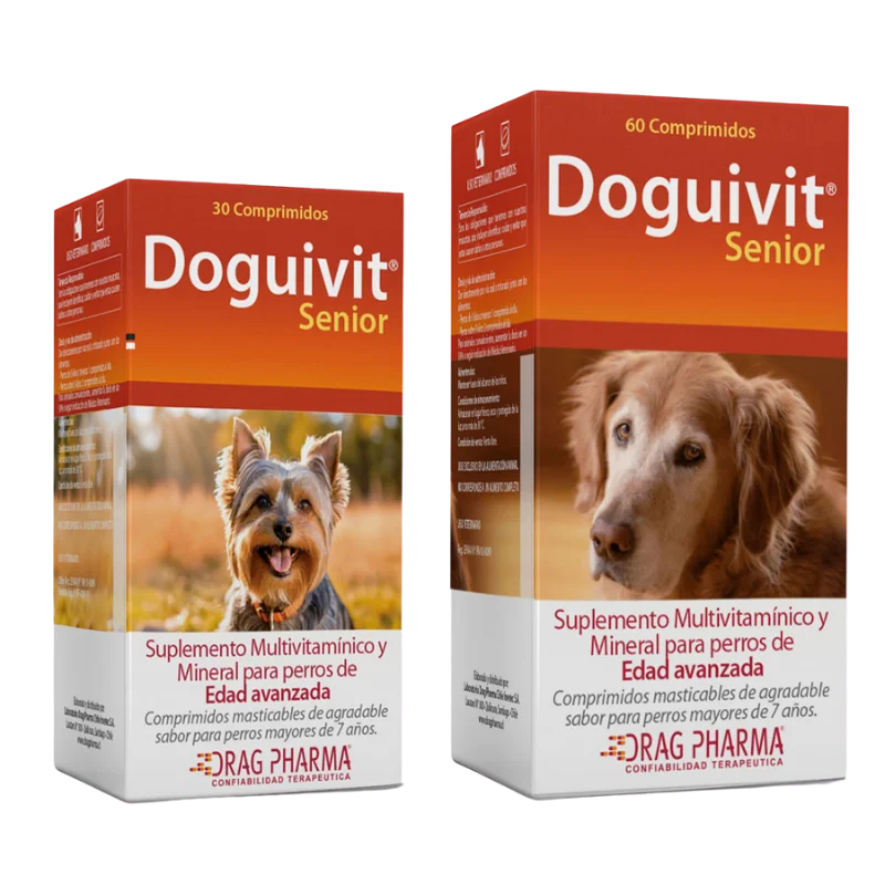 Doguivit® Senior es un suplemento multivitamínico y mineral especialmente formulado para perros de edad avanzada que presentan estados carenciales, condiciones de estrés, convalecencia o desgaste natural asociado a la vejez. Su fórmula incluye Condroitín sulfato y extracto de Schisandra, que ayudan a mantener la salud articular y la vitalidad general.