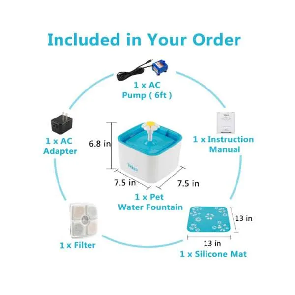 La fuente de agua para mascotas está equipado con su filtro, compuesto de una capa de algodón, carbón activo, y una resina de intercambio iónico. forman un triple sistema de filtrado para evitar que sus mascotas se enfermen. Su sistema silencioso y de bajo costo , compuesto por una bomba diseñada para ser silenciosa y absorber posibles golpes, incluso pede dormir al lado de ella (medido por debajo de 40 dB). Al mismo tiempo, se trata de una bomba de ahorro de energía. El consumo de energía total es de aproximadamente: 1,51 kW/h por mes y la bomba normalmente durar entre 2,5 – 4 años (> 20.000 h.). Capacidad de 2.5 Litros de agua, lo que hace que no sea necesario reponer con frecuencia, y el agua almacenada se puede utilizar durante 7 días. Por lo que incluso si usted salir durante un largo período de tiempo, no hay necesidad de preocuparse por reponer el agua. (por favor, deje que el dispensador de agua funcione normalmente durante dos horas antes del uso oficial).