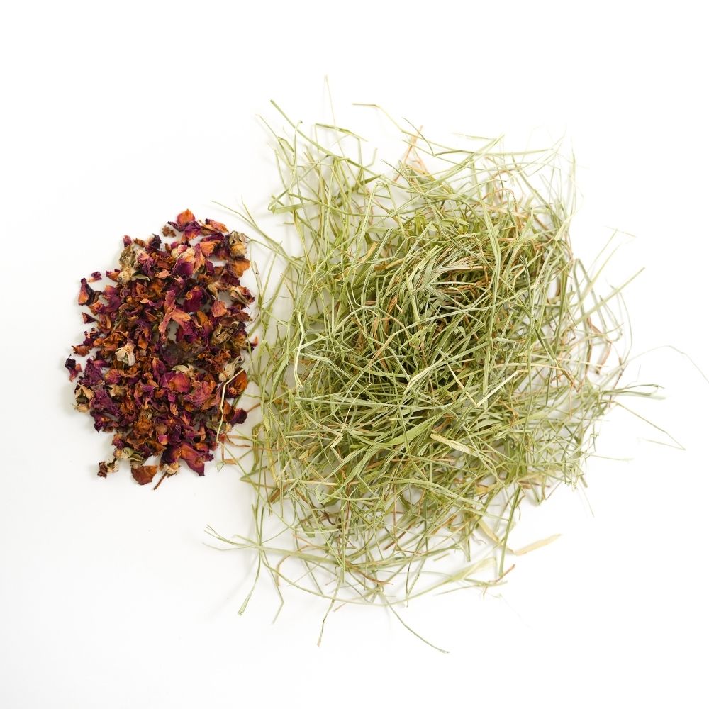 Los pétalos de rosa no solo añaden un aroma y sabor únicos, sino que también convierten este heno en una opción atractiva para las mascotas más exigentes.