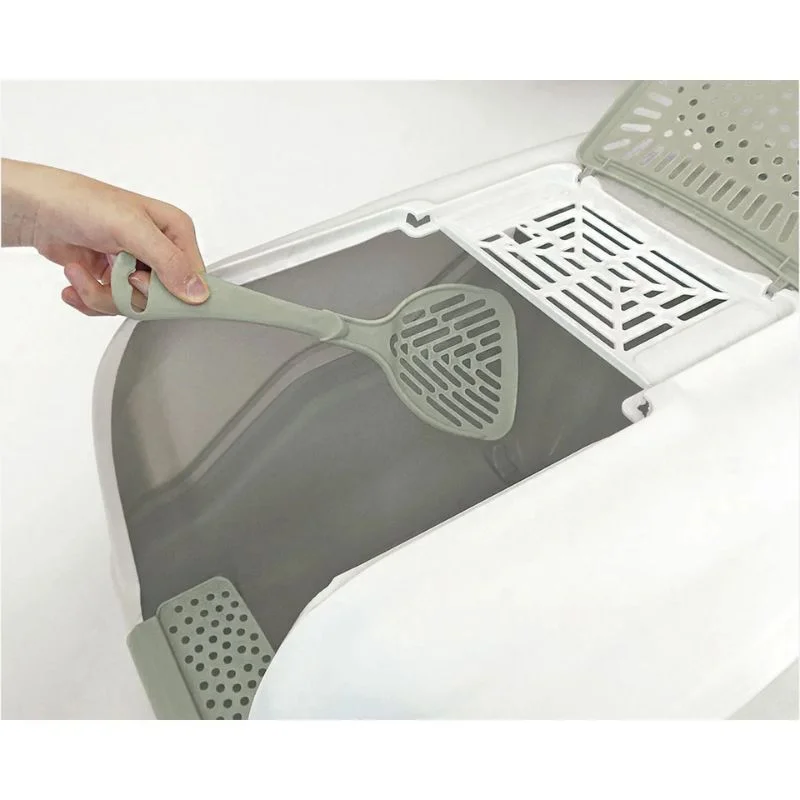 Fabricado con materiales resistentes y duraderos, este baño cuenta con una amplia apertura frontal que permite un fácil acceso tanto para el gato como para el humano al momento de limpiar. Además, incluye una pala extraíble y una tapa superior abatible que simplifica aún más el proceso de aseo del arenero.
