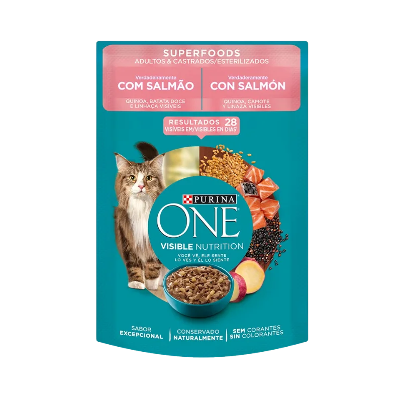 Purina One Alimento Húmedo Gato Superfoods Salmón es un alimento completo y balanceado que combina el delicioso sabor del salmón con ingredientes de alta densidad nutricional como quinoa, camote y linaza. Diseñado para todas las etapas de vida, este alimento proporciona una nutrición óptima que mejora la salud y el bienestar de tu gato. Conservado naturalmente y libre de colorantes, es una opción saludable que tu mascota amará.