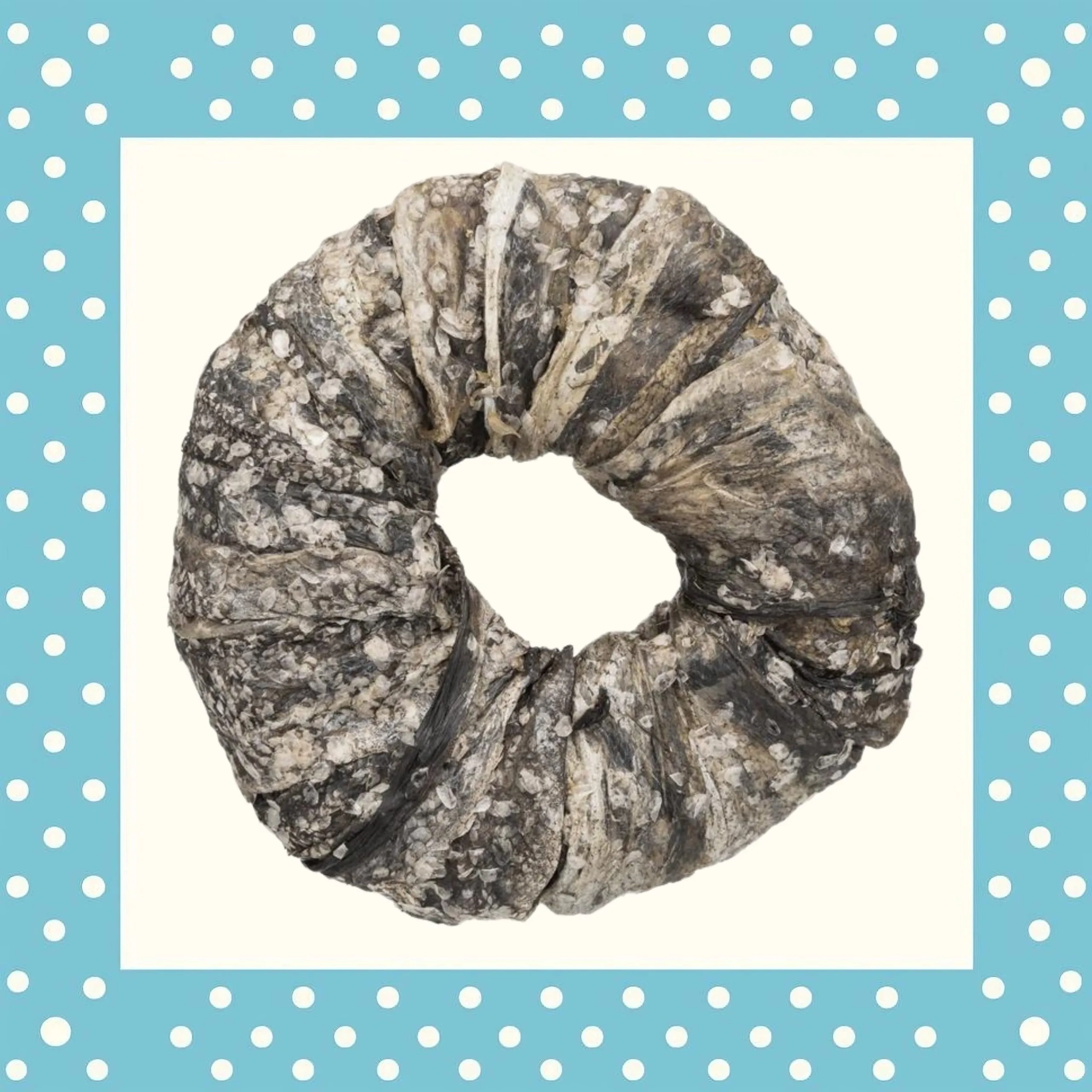 Deliciosos Roscos de pescado para perros, totalmente naturales compuestos por rosco de calcio interior y cubierta de piel de bacalao deshidratada. Es una rica chuche natural que les encantará!!!.