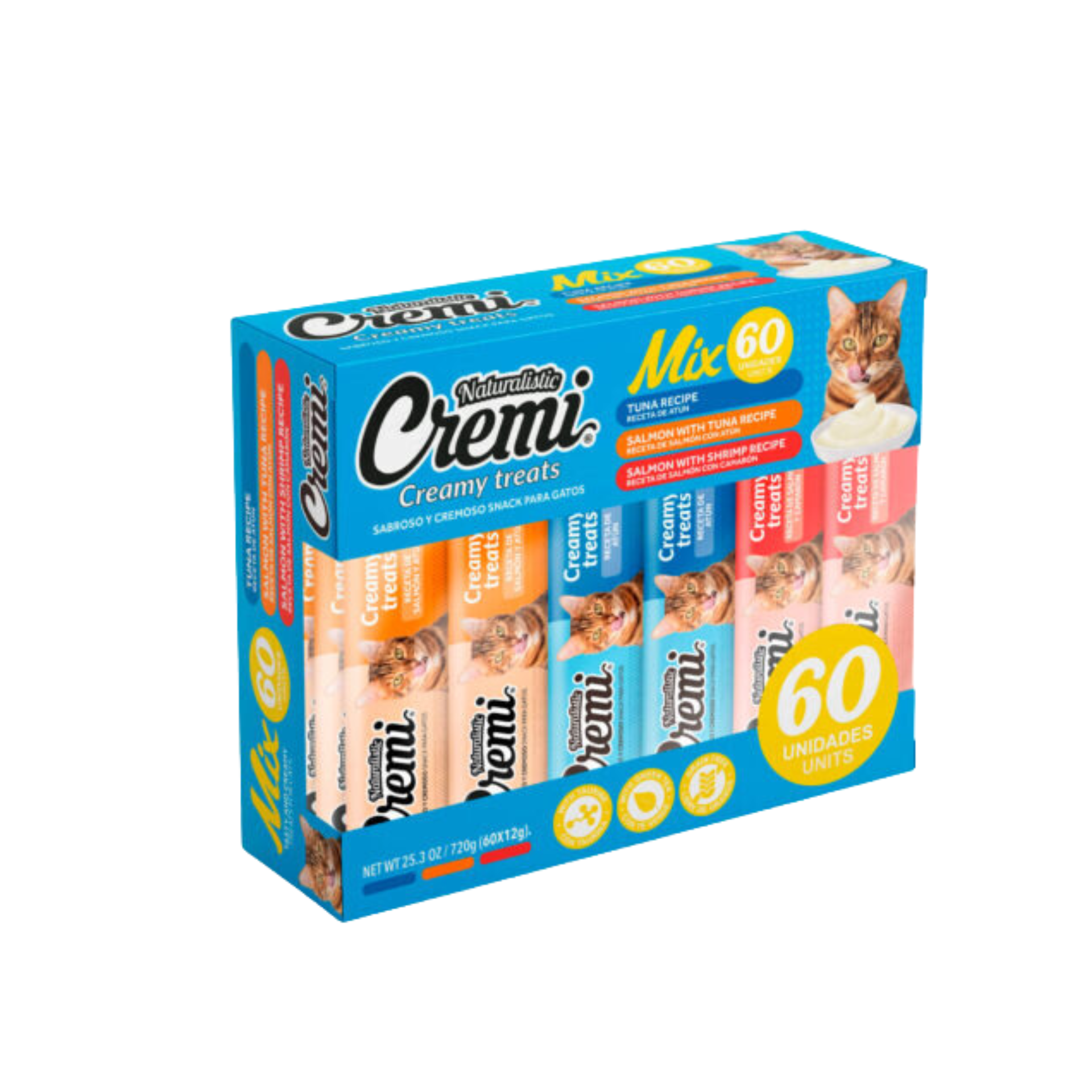 Descubre la excelencia en alimentación felina con Naturalistic Cremi Mix Variedades Atún, el increíble pack que cautivará el paladar de tu gato. Este paquete exclusivo contiene 60 tubos de Cremi en un fascinante mix de sus irresistibles variedades de Atún, Atún/Salmón y Salmón/Camarón.