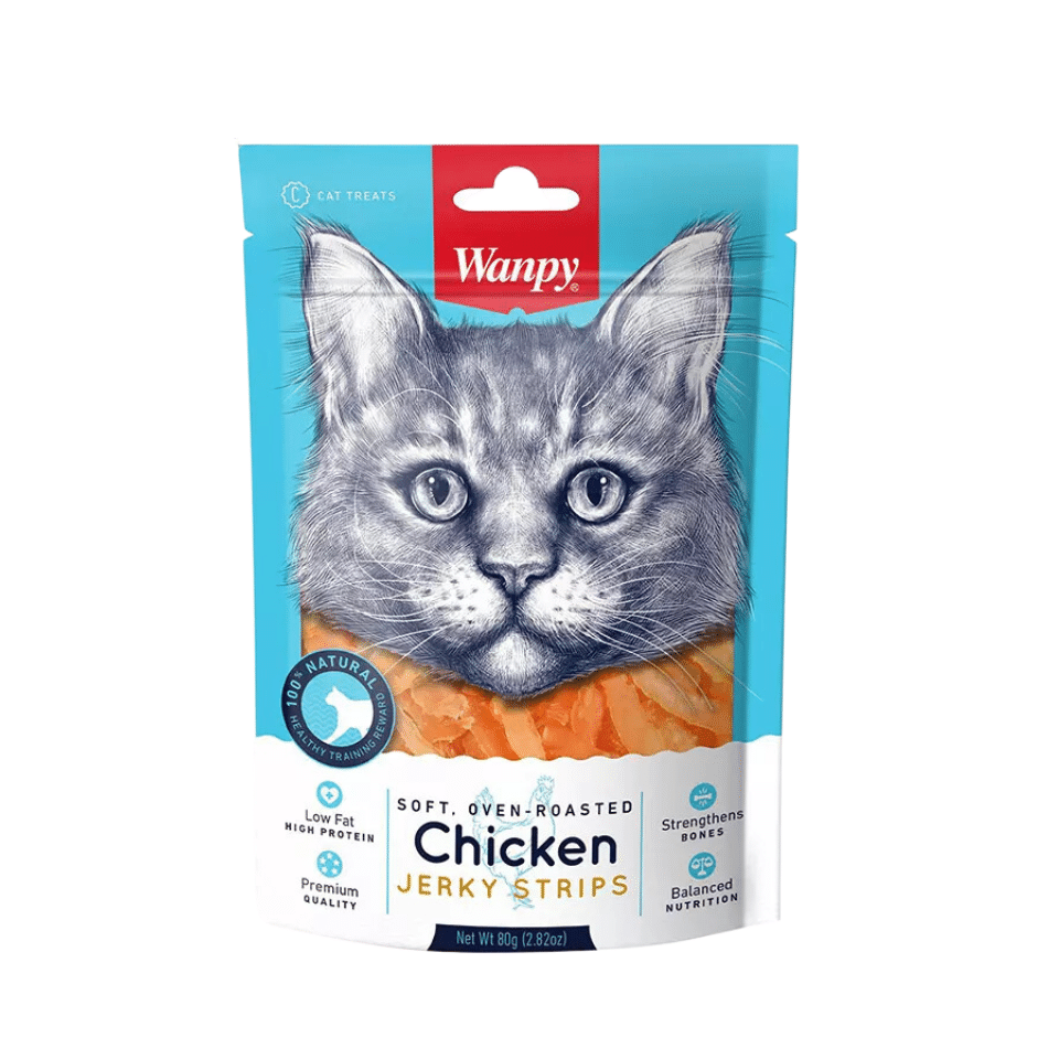 Wanpy Soft Chickenk Jerky Strips son deliciosos snacks para gatos adultos, con suaves tiritas de pechuga de pollo cuya receta incluye carne de pollo 100% natural, bajo en grasas y alto en proteínas.